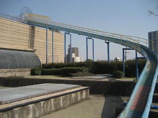 After lunch we walked back across the bridge and spotted a frightening sight - a kid sliding down a slide...but not any slide....a slide that went from the roof of a building to the floor below! We found the entrance and discovered a weird rooftop park, complete with Astroturf, men playing mah jong, strange vents and the slide of death. Of course we had to try it and video it.Here's video of Elspeth going down the slide